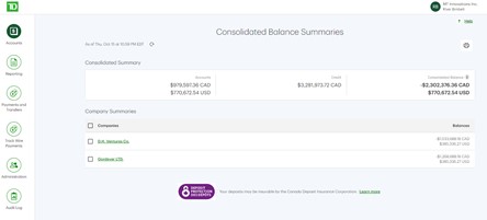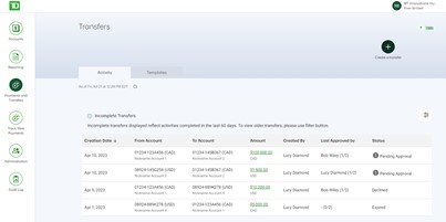 Transferts de fonds entre des comptes de dépôt d’entreprise TD autorisés en dollars canadiens ou en dollars américains.