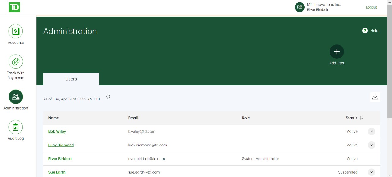Une fois le formulaire d’inscription au Centre pour entreprises TD soumis à votre équipe des Services de gestion de trésorerie, votre administrateur de système recevra un courriel de notre part contenant un lien d’inscription.