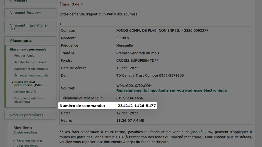 Assurez-vous que le bon compte Fonds Mutuels TD est sélectionné dans le menu déroulant Compte.